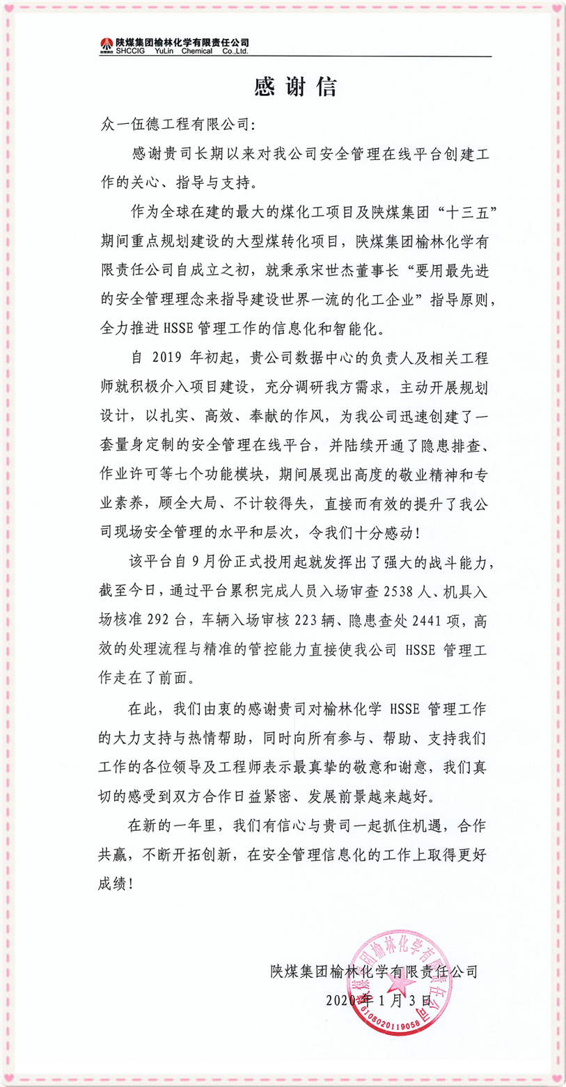 近日收到了来自陕煤集团榆林化学责任有限公司(下简称“榆林化学”)长长的感谢信!感谢我公司在为榆林化学建设全球在建的最大的煤化工转化项目提供PMC服务的过程中,助力其搭建的安全管理智慧平台,全面推进了HSSE管理工作的信息化和智能化,提高管理效率。