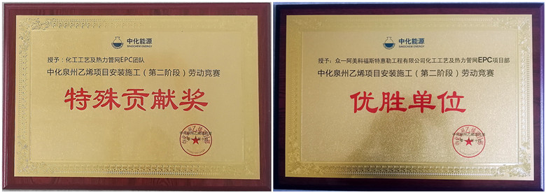中化泉州EPC项目部在该项目的建设中已经连续两次获得“特殊贡献”及“优胜团队”两个重磅团队奖。这是团队执行和综合实力的重要体现。这两个沉甸甸的荣誉,是对参与该项目的每一位众阿福人兢兢业业,拼搏进取,保质保量圆满完成各阶段的责任目标的褒奖和鼓励。