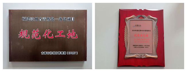2020年12月30日,在古雷石化2020年第四季度暨年度HSSE管理委员会会议上,伍德中国古雷石化EPC项目部在同场竞技的十五家参建单位中,凭借卓越的管理能力和优秀工程成果,勇夺“2020年度优秀HSSE管理单位”荣誉奖牌和十二月份“规范化工地”流动奖牌,取得工程建设安全管理和文明施工双丰收。